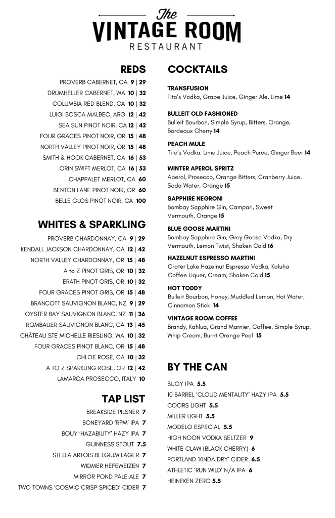Drink Menu Click Here toView Menu Dinner Menu Click Here toView Menu Entrée Menu Click Here to View Menu SUNDAY BRUNCH MENU Click Here to View Menu DESSERT MENU Click Here to View Menu